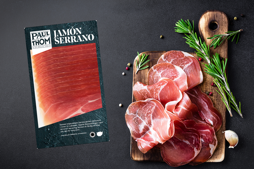 Beskrivning: Underbar Serrano i 70g förpackning. Lufttorkad i minst 12 månader. Fin i smaken med balanserad sälta och nötighet. Perfekt till buffén, tapas eller till matlagning (god med kycklingfilé och sparris). Eller rosta i ugnen och servera till aperitifen, krispigt och gott.